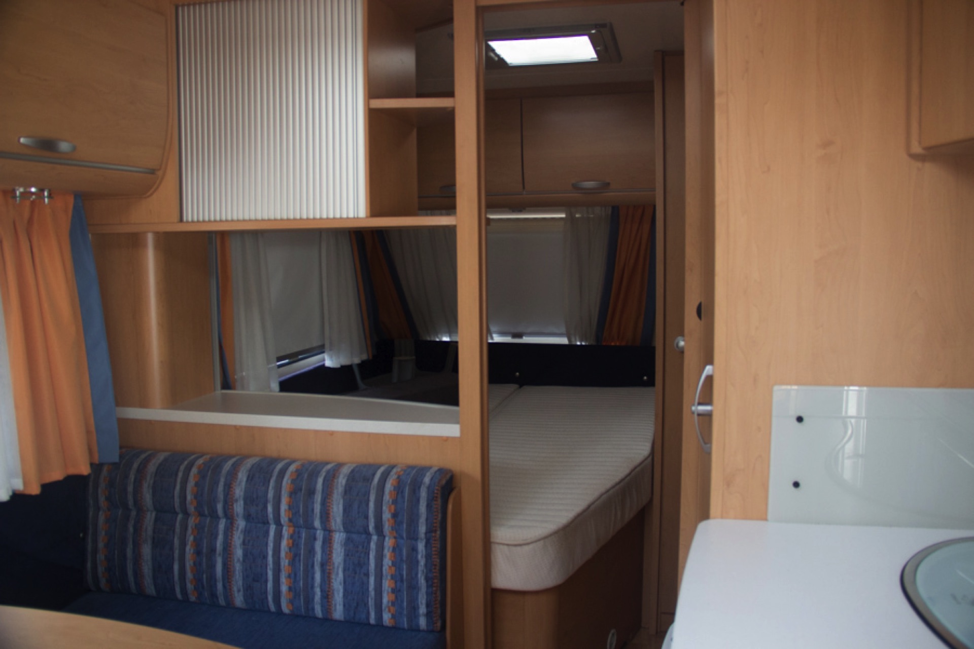 Przyczepa stoi po prawej stronie od wjazdu, w okolicy małych sanitariatów. Przedsionek jest częściowo osłonięty drzewami. Przed przyczepą jest miejsce do siedzenia.