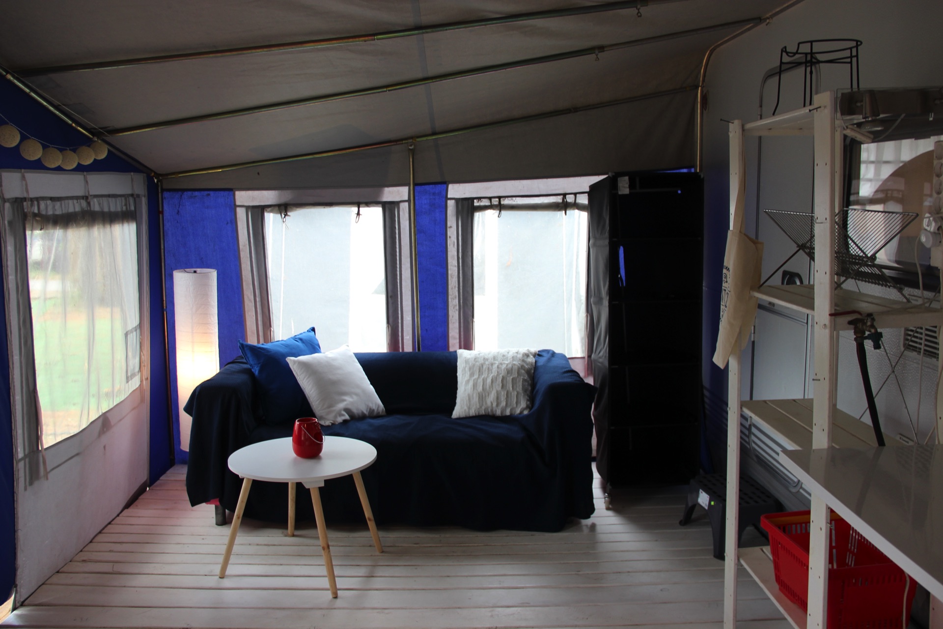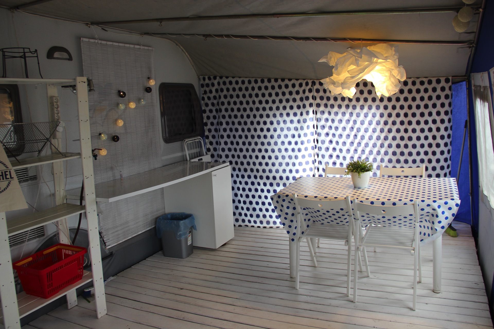Przyczepa stoi po prawej stronie od wjazdu, w okolicy małych sanitariatów w zadrzewionej części.  Przed przyczepą jest miejsce do siedzenia.